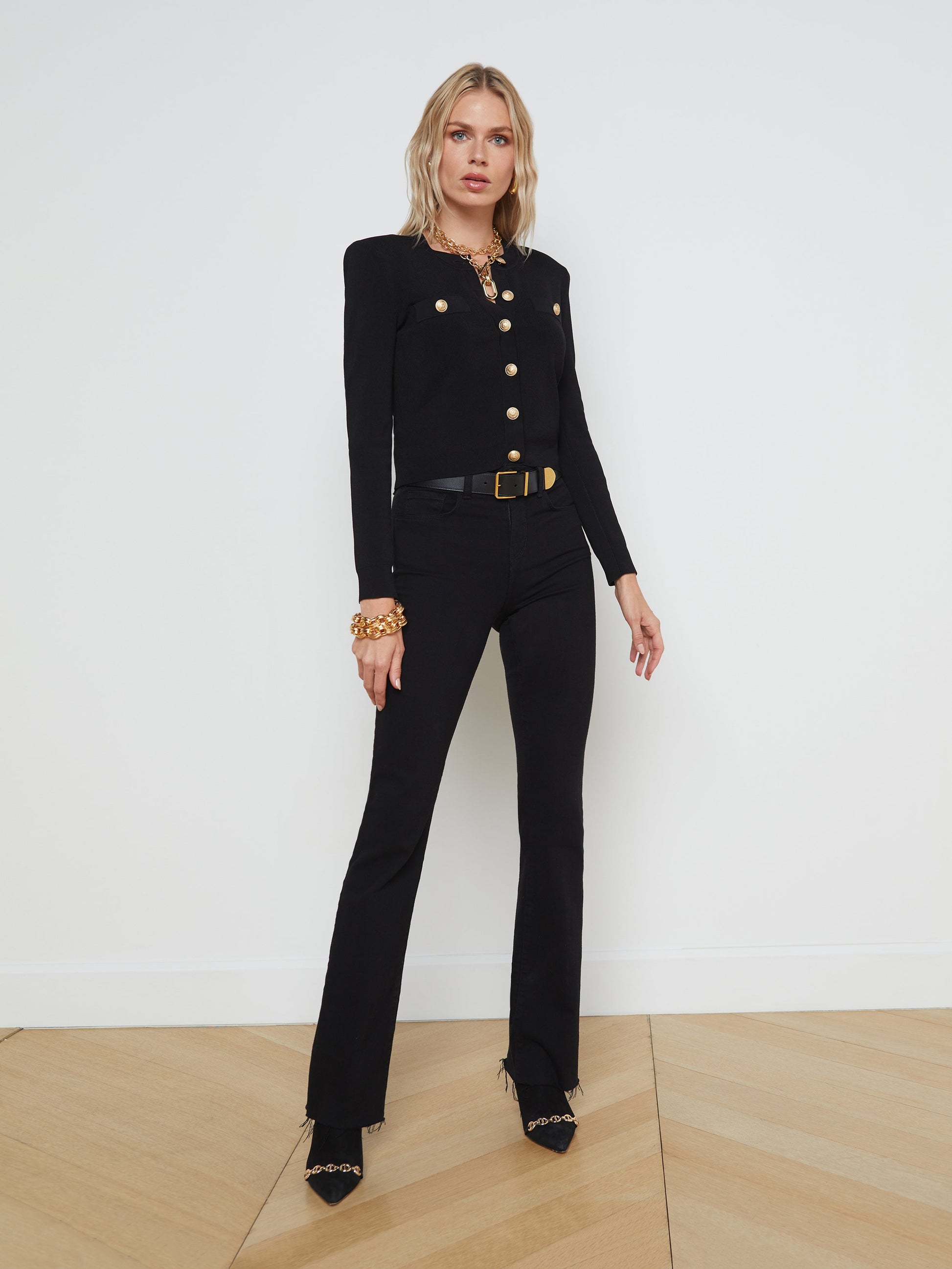 A timeless cropped crew-neck cardigan in true black. Supple power knit style softly drapes from strong shoulders to trim cropped waist. Includes faux welt pockets detailed with luxe gold embossed-domed buttons, and matching front button closure.